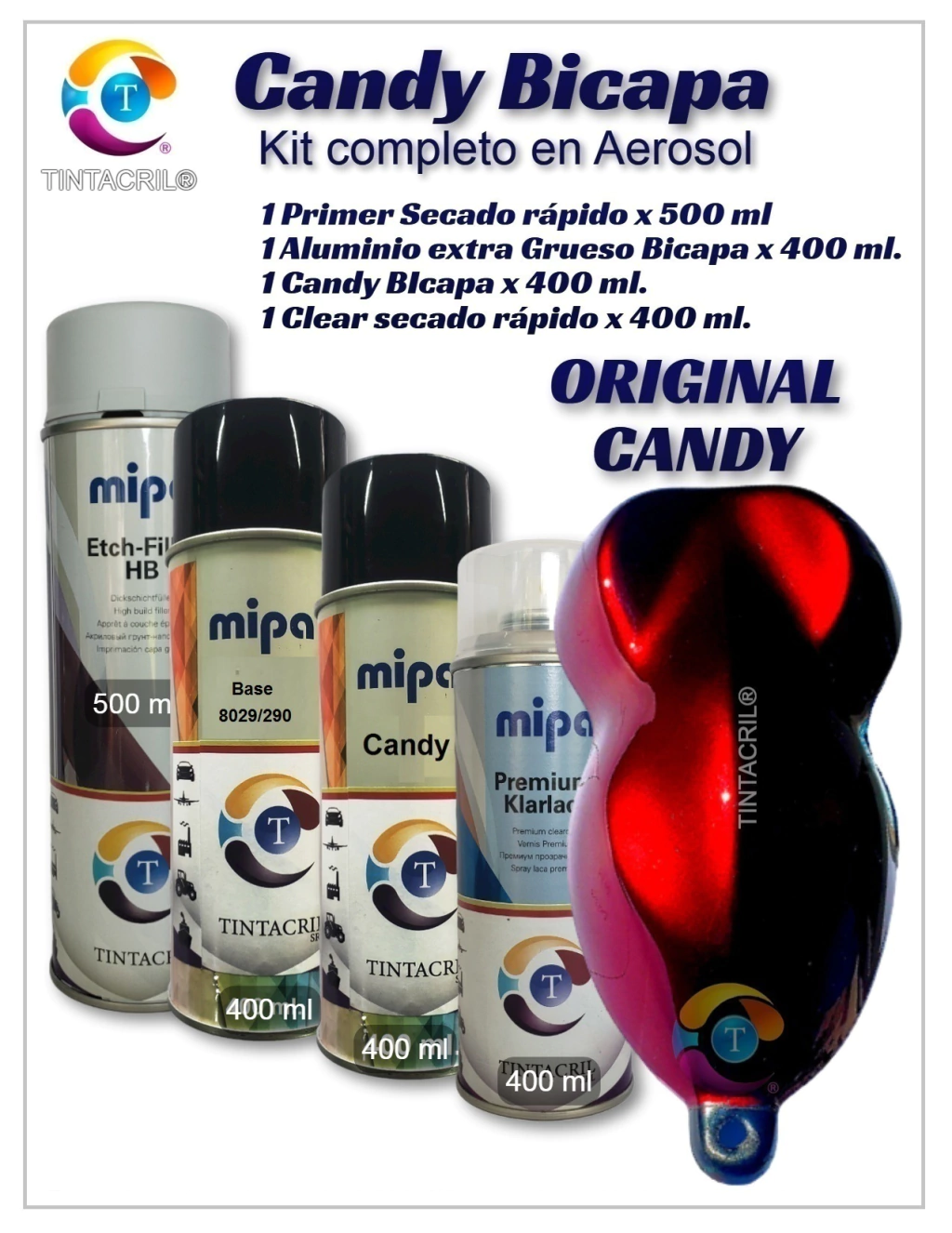 TINTACRIL® S.R.L.Kit incluye : 1 Aerosol Primer x 500 ml + 1 Base 8029/290 Prl. Effect x 400 ml. + 1 Aerosol Candy Bicapa x 400 ml. + 1 Aerosol Clear Brillante de terminación (4 Aersoles)