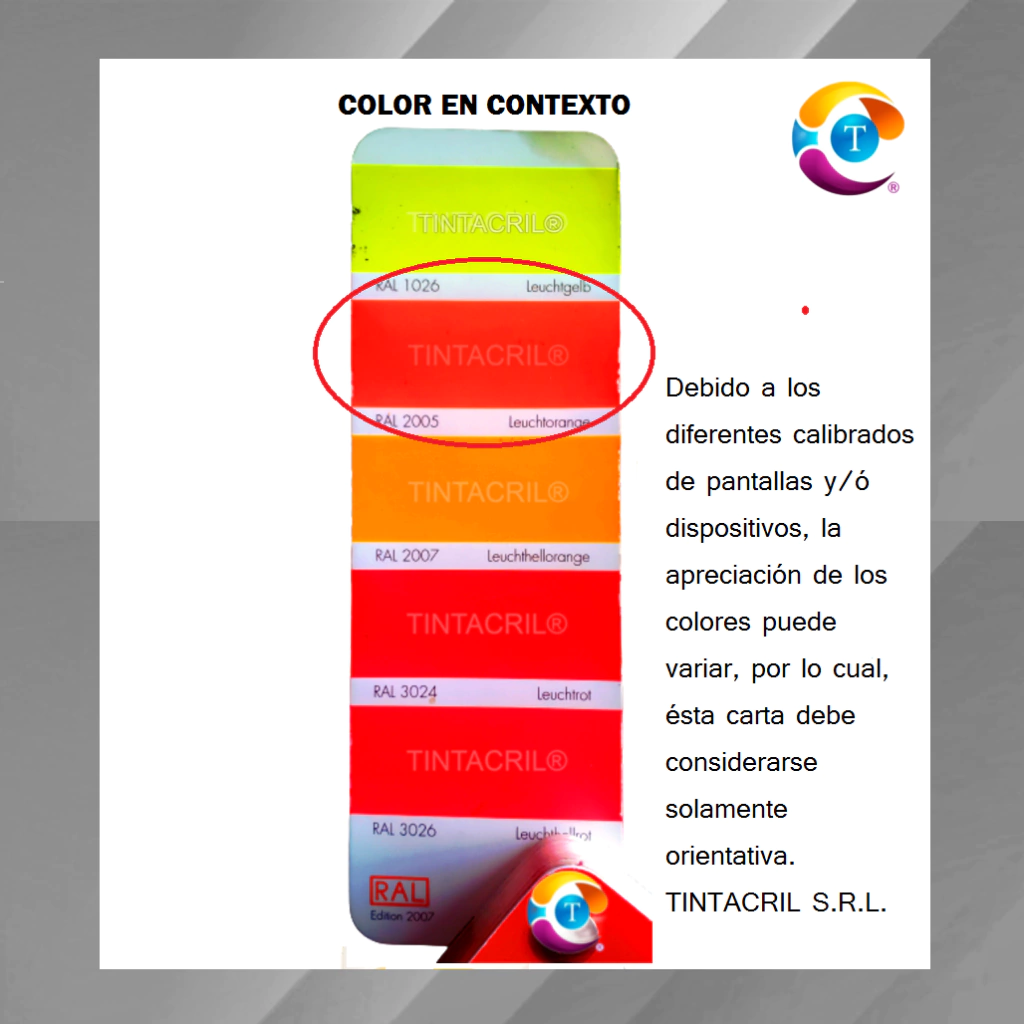 Característica de los colores fluorescentes: Sensibles a los rayos UV. No se recomienda su uso en superfices estáticas expuestas a la intemperie.